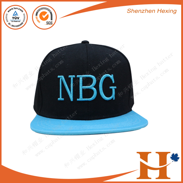 100%亚克力面料,黑色帽身配天蓝色帽舌,前片3D刺绣英文LOGO“NBG”,尾带可调节,成人尺寸58CM,7CM帽舌走4线