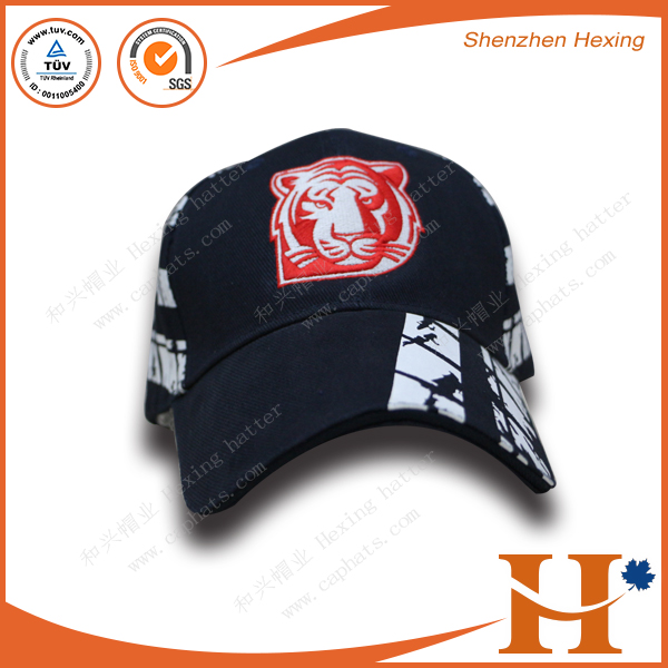 100%全棉面料,黑色六片运动帽,两侧、帽舌印刷logo,前片刺绣老虎头像LOGO,尾带可调节,成人尺寸58CM,8CM帽舌