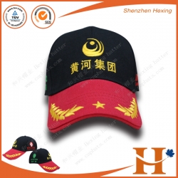 100%全棉面料,深圳帽子厂订制品牌宣传帽,7CM帽舌走3线,帽舌刺绣金色麦穗,前页刺绣品牌宣传logo“黄河集团”,尾带可调节,成人尺寸58CM