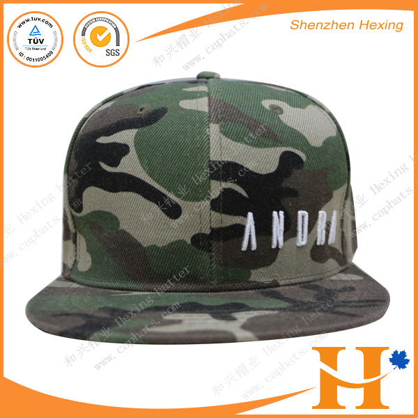100%亚克力面料,迷彩六片平板帽,前片3D刺绣LOGO“ANDRA”,尾带可调节,成人尺寸58CM,7CM帽舌走4线