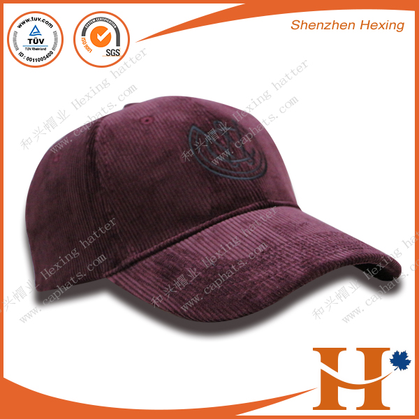 100%灯芯绒面料,枣红色、黑色六片高尔夫球帽,8CM帽舌走4线,前片刺绣LOGO,尾带可调节,成人尺寸58CM