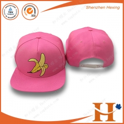 100%全棉面料,粉色五片平板帽,前片印刷香蕉图案LOGO,尾带可调节,成人尺寸58CM,7CM帽舌走4线