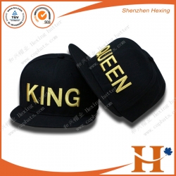 100%亚克力面料,黑色六片平板帽,前片3D金色丝线刺绣“KING QUEEN”,尾带可调节,成人尺寸58CM,7CM帽舌走4线