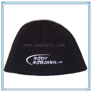 100%腈纶面料,深圳帽子厂订制黑色针织帽,帽边刺绣logo“body building”,成人尺寸58CM
